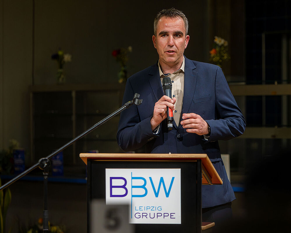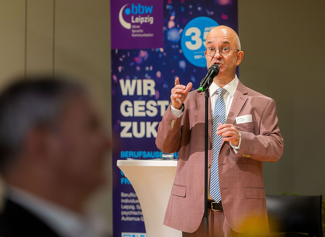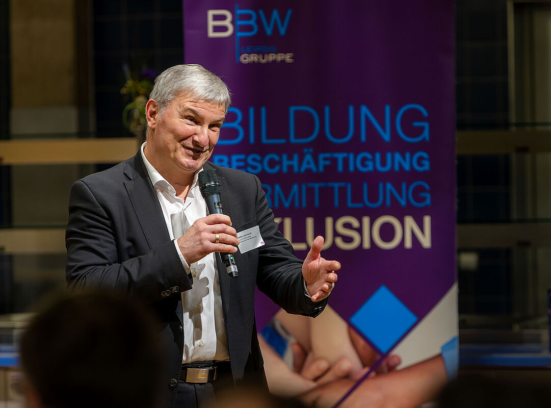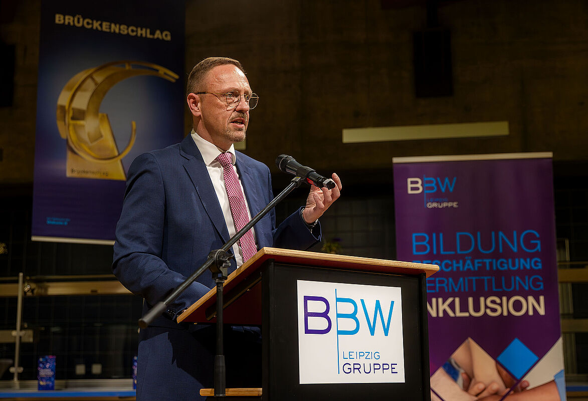 Der zweite „Brückenschlag“-Preis ging an die Agentur für Arbeit Leipzig. Besonders hervorgehoben wurde dabei das Engagement der Reha-Berater*innen, die junge Menschen mit Reha-Status auf ihrem Weg in Ausbildung und Beruf begleiten und gemeinsam mit Partnern Perspektiven für eine nachhaltige Integration schaffen. "Es ist ausgesprochen wichtig, dass wir in Partnerschaften denken und in Partnerschaften arbeiten. Ein dickes Dankeschön geht an die BBW-Leipzig-Gruppe. Wir nutzen zum Beispiel immer den Aktionstag Schichtwechsel, wo Mitarbeitende aus der Werkstatt zum Beispiel in die Agentur für Arbeit Leipzig kommen für einen Austausch und Mitarbeitende von der Agentur für Arbeit in die Diakonie am Thonberg für einen Tag gehen, um dort eben auch einen kleinen Perspektivwechsel zu haben und sich auszutauschen. Danke an alle, die in der Inklusion tätig sind“, so Steffen Leonhardi, Vorsitzender der Geschäftsführung der Agentur für Arbeit Leipzig, in seiner Danksagung.